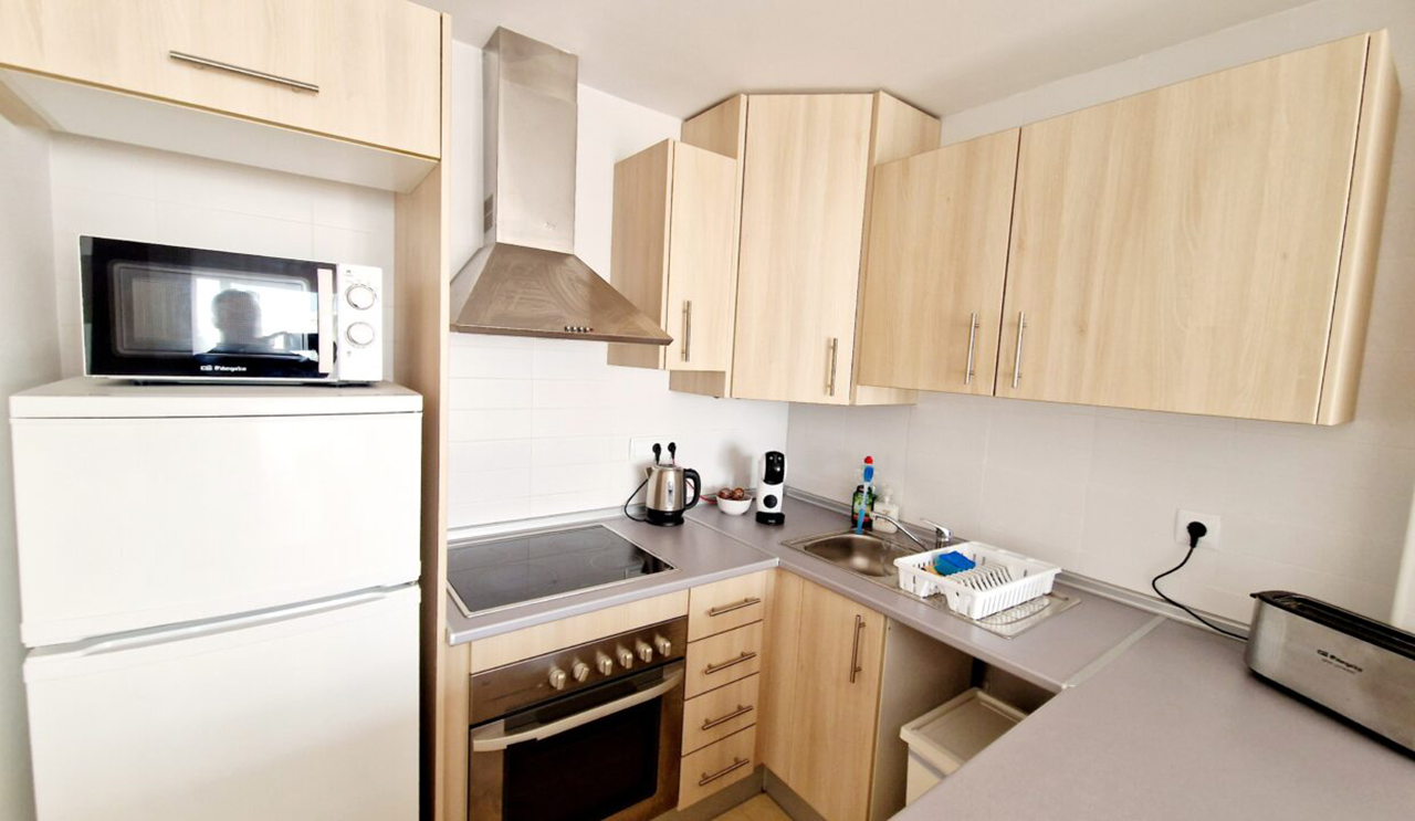 L’appartement d’angle situé au deuxième étage propose un salon & salle à manger avec une cuisine équipée ouverte, deux chambres et une salle de bains.