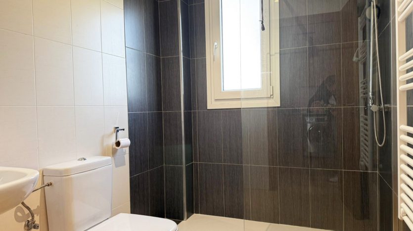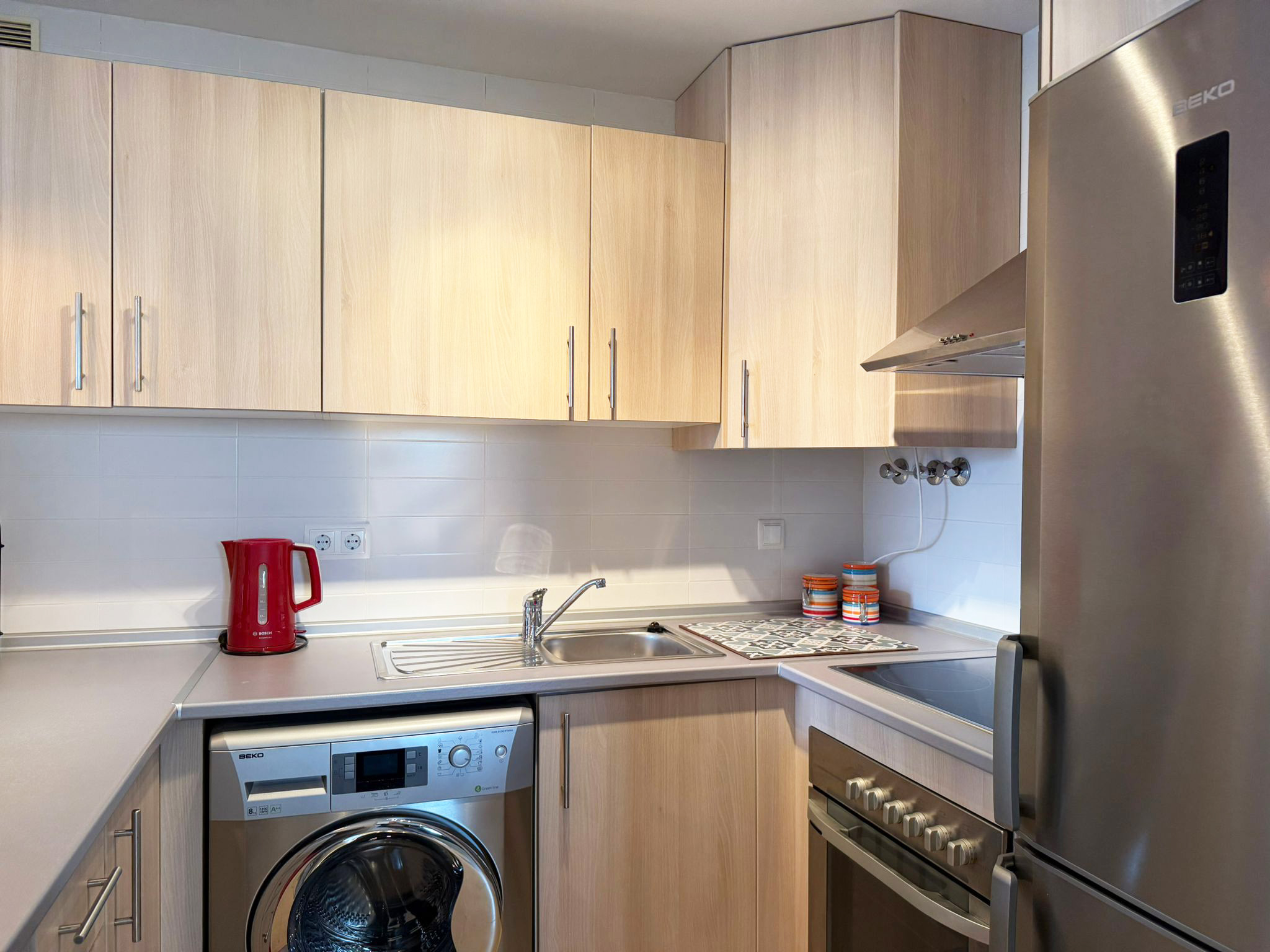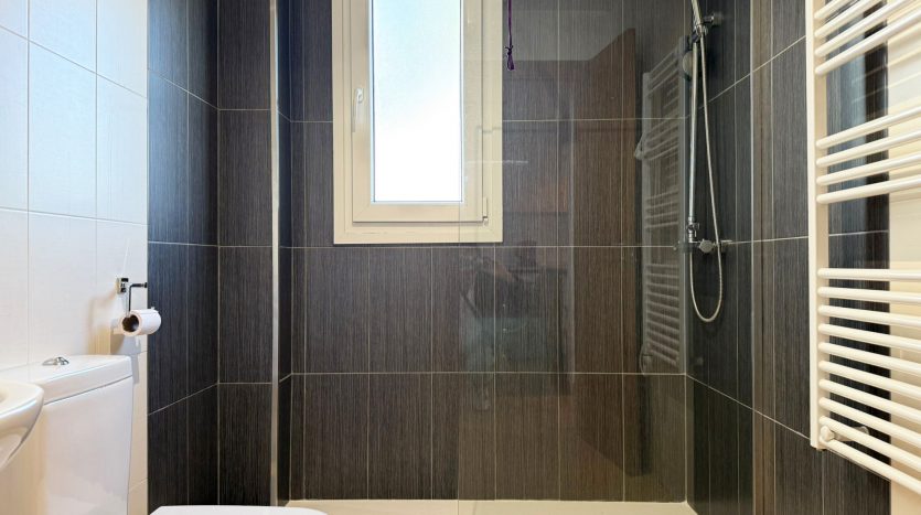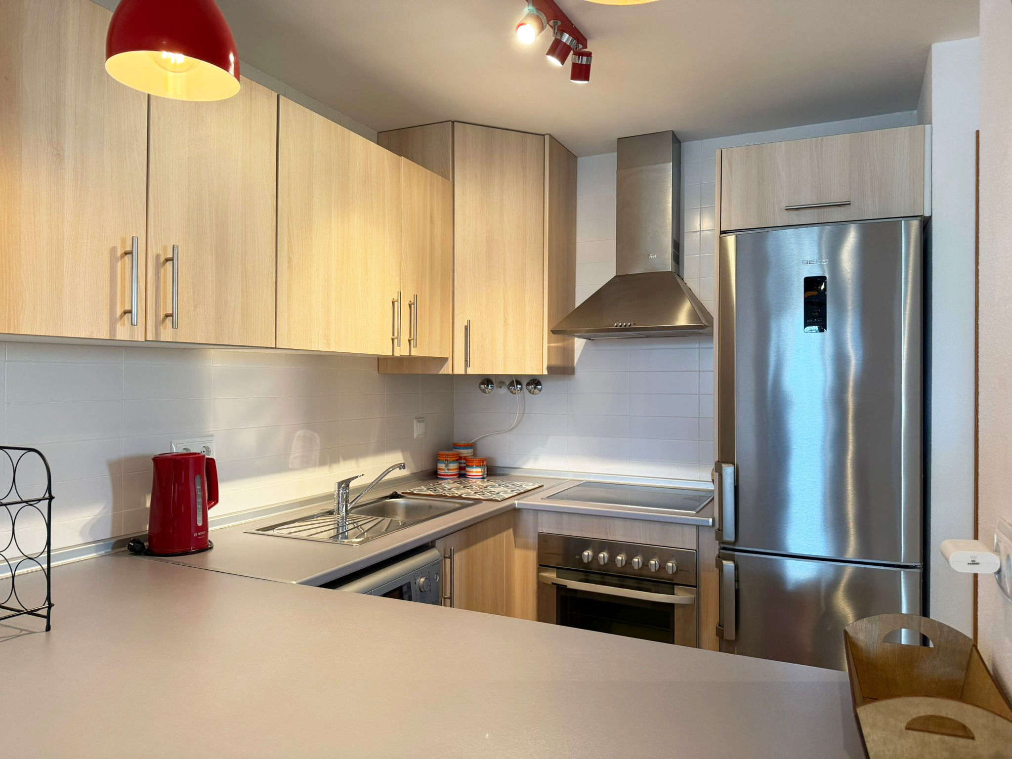 L’appartement d’angle situé au premier étage propose un salon & salle à manger avec une cuisine équipée ouverte, deux chambres et une salle de bains.