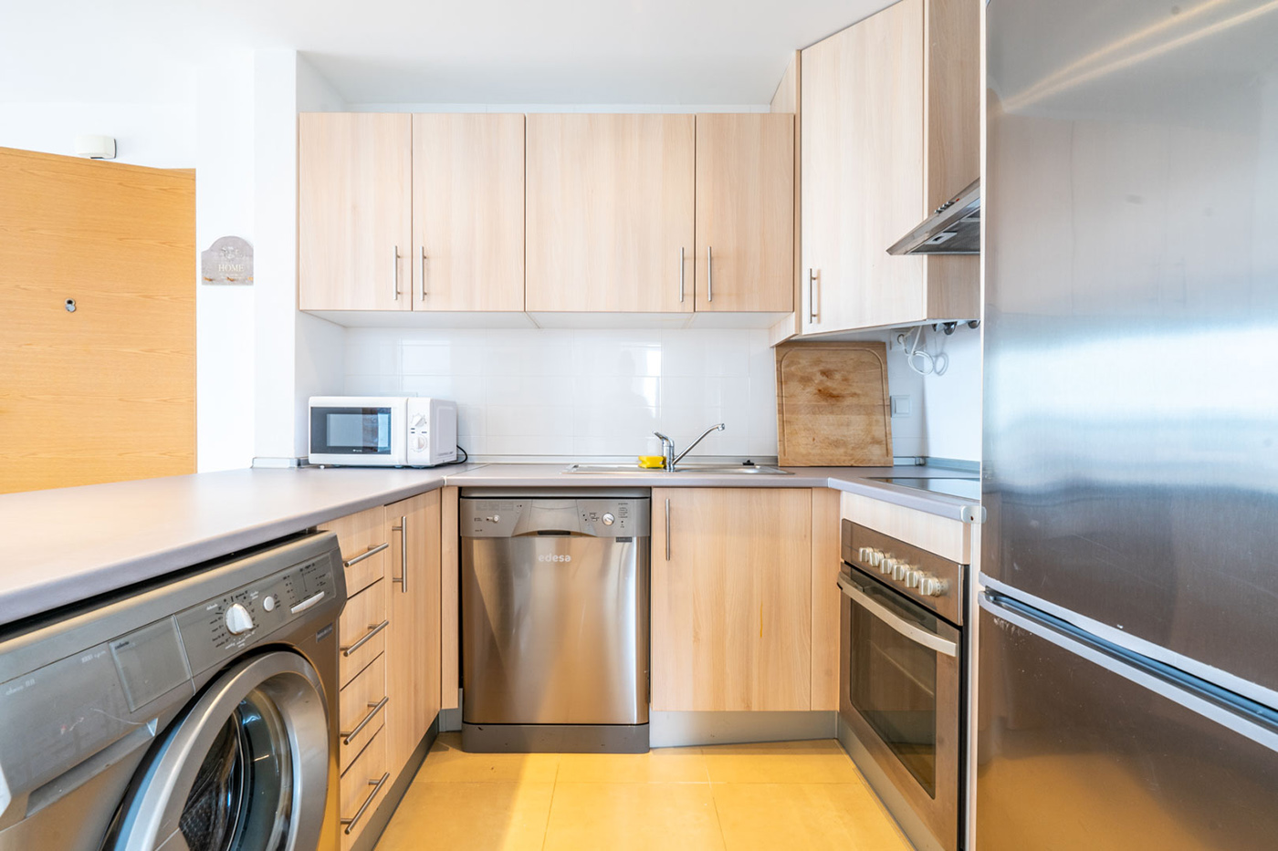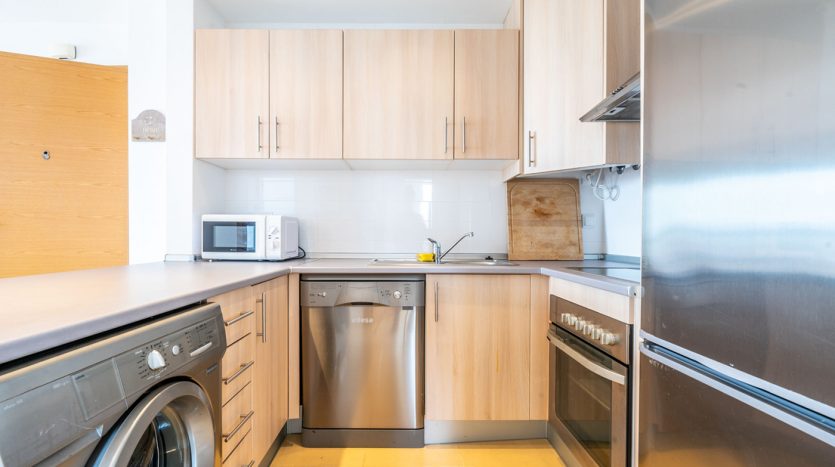 L’appartement d’angle situé au deuxième étage propose un salon & salle à manger avec une cuisine ouverte, deux chambres et une salle de bains.