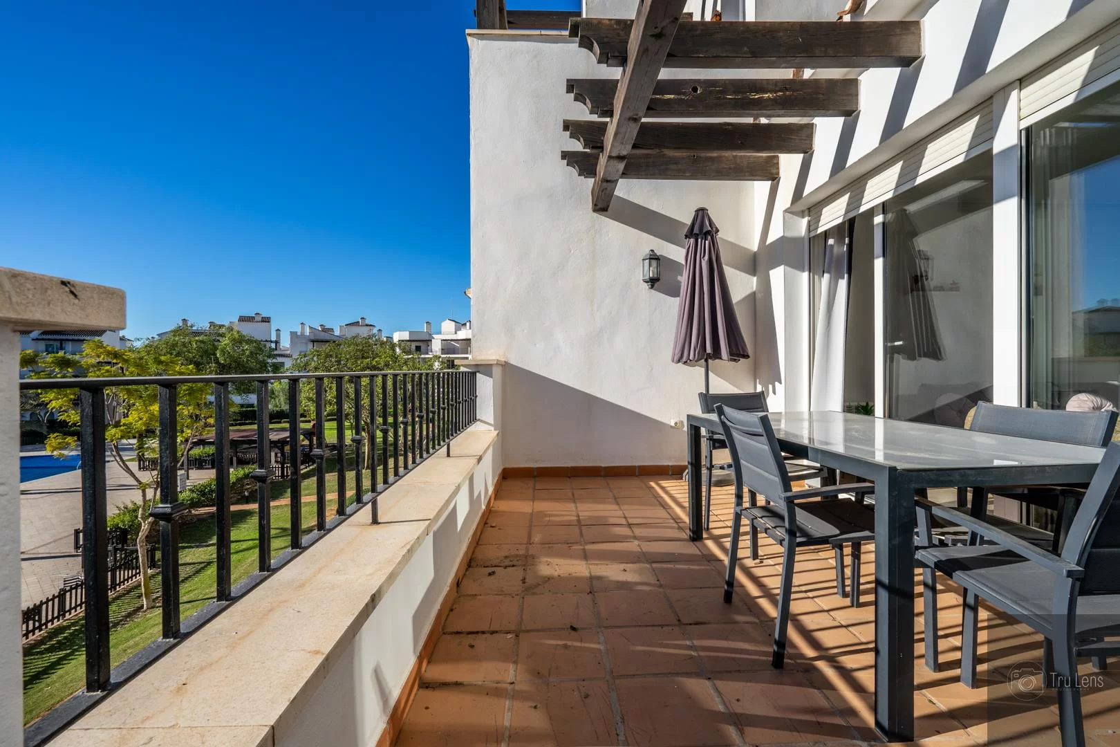 L’appartement dispose d’une terrasse avec vue sur les espaces communautaires et sa superbe piscine.