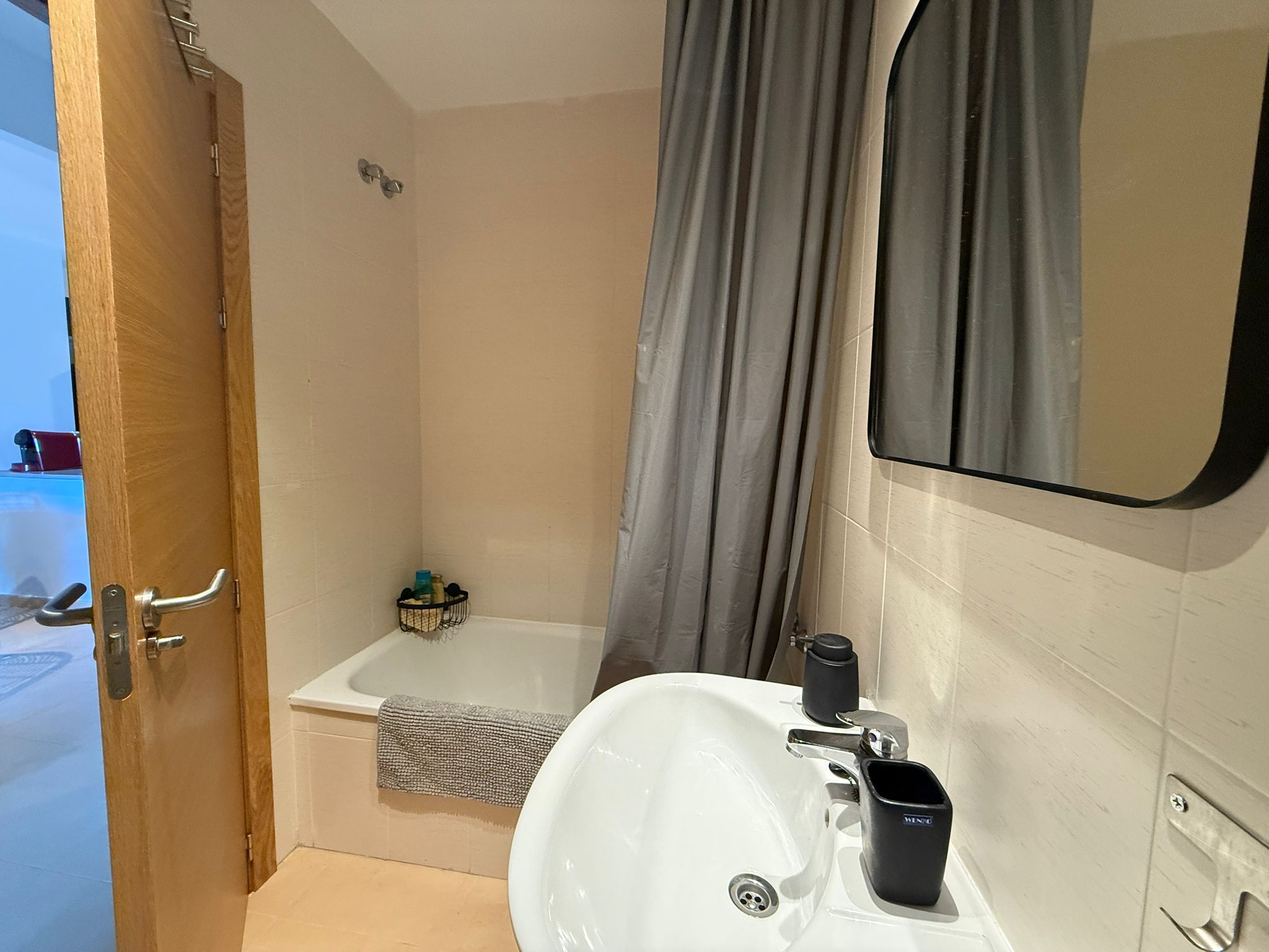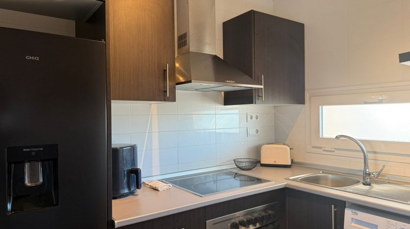 L’appartement situé au deuxième étage propose un salon & salle à manger avec une cuisine équipée ouverte, deux chambres et une salle de bains.