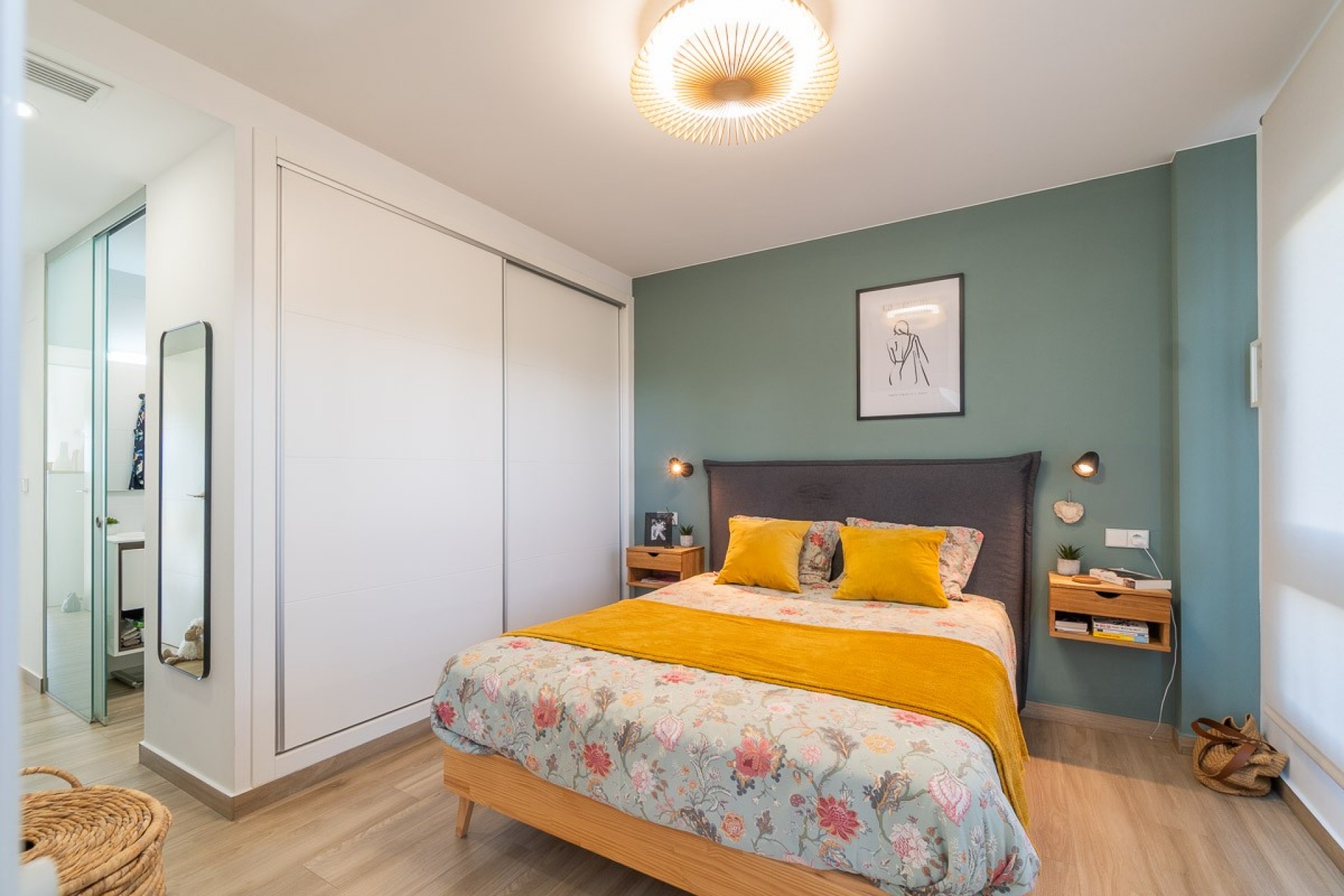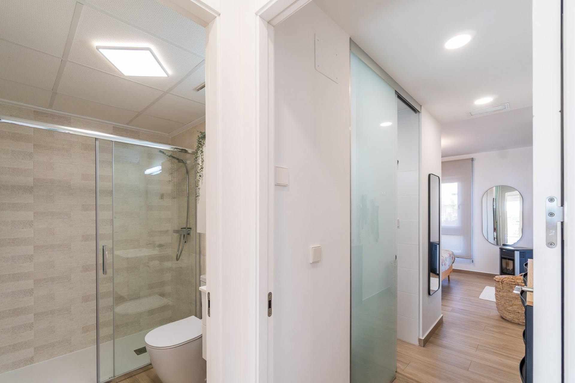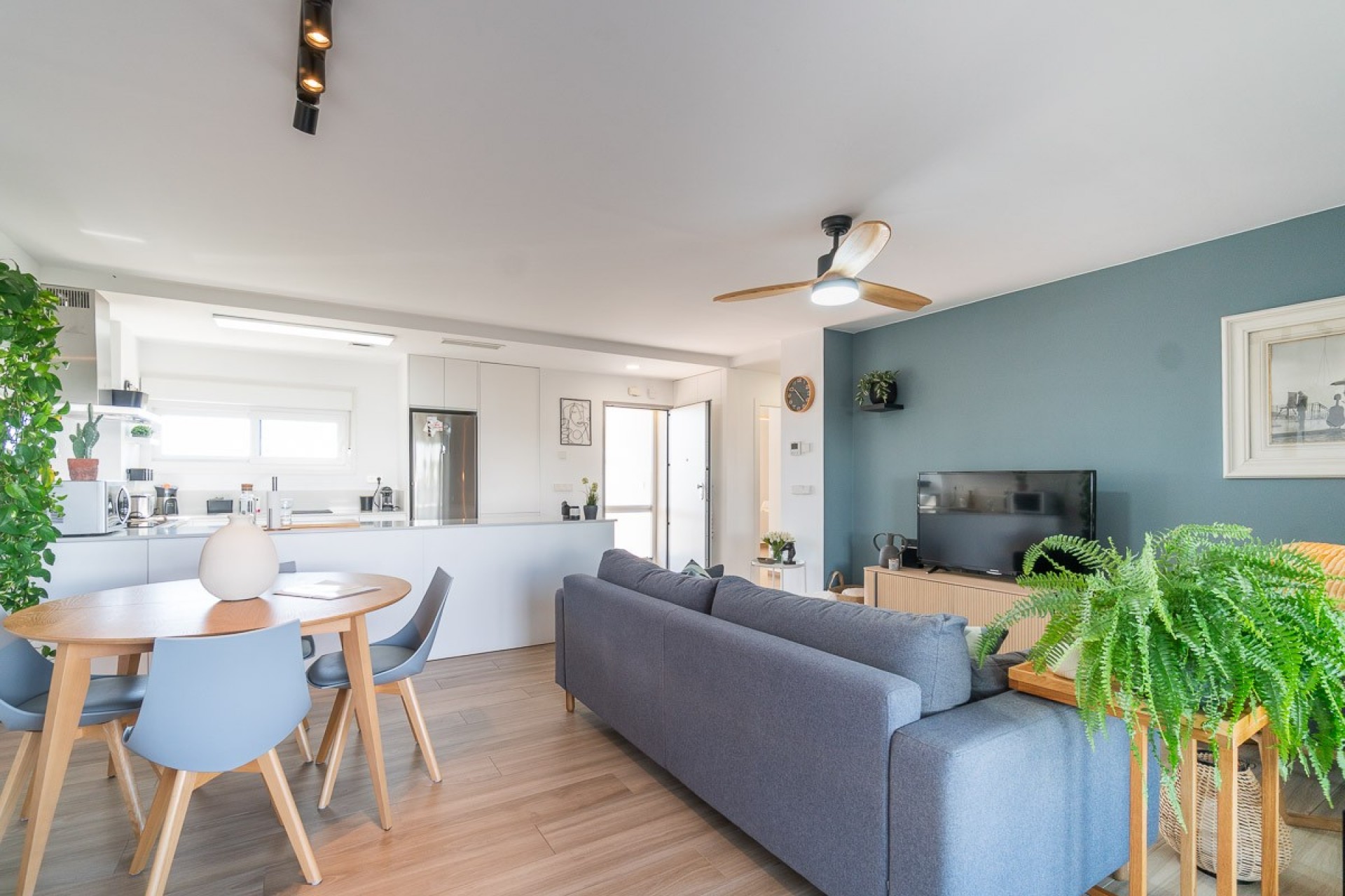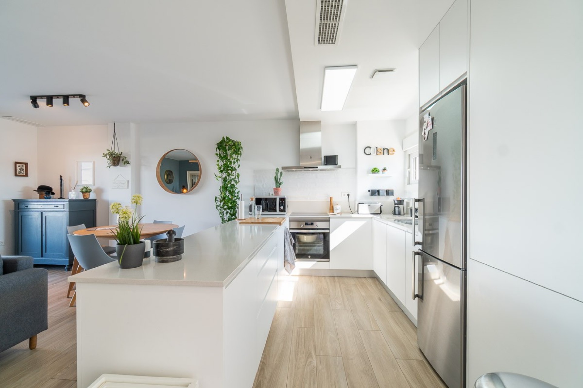 L’appartement construit en 2022 est situé au rez de chaussée propose, un salon salle à manger avec cuisine américaine ouverte, deux chambres doubles et deux salles de bains, dont une dans la chambre principale.