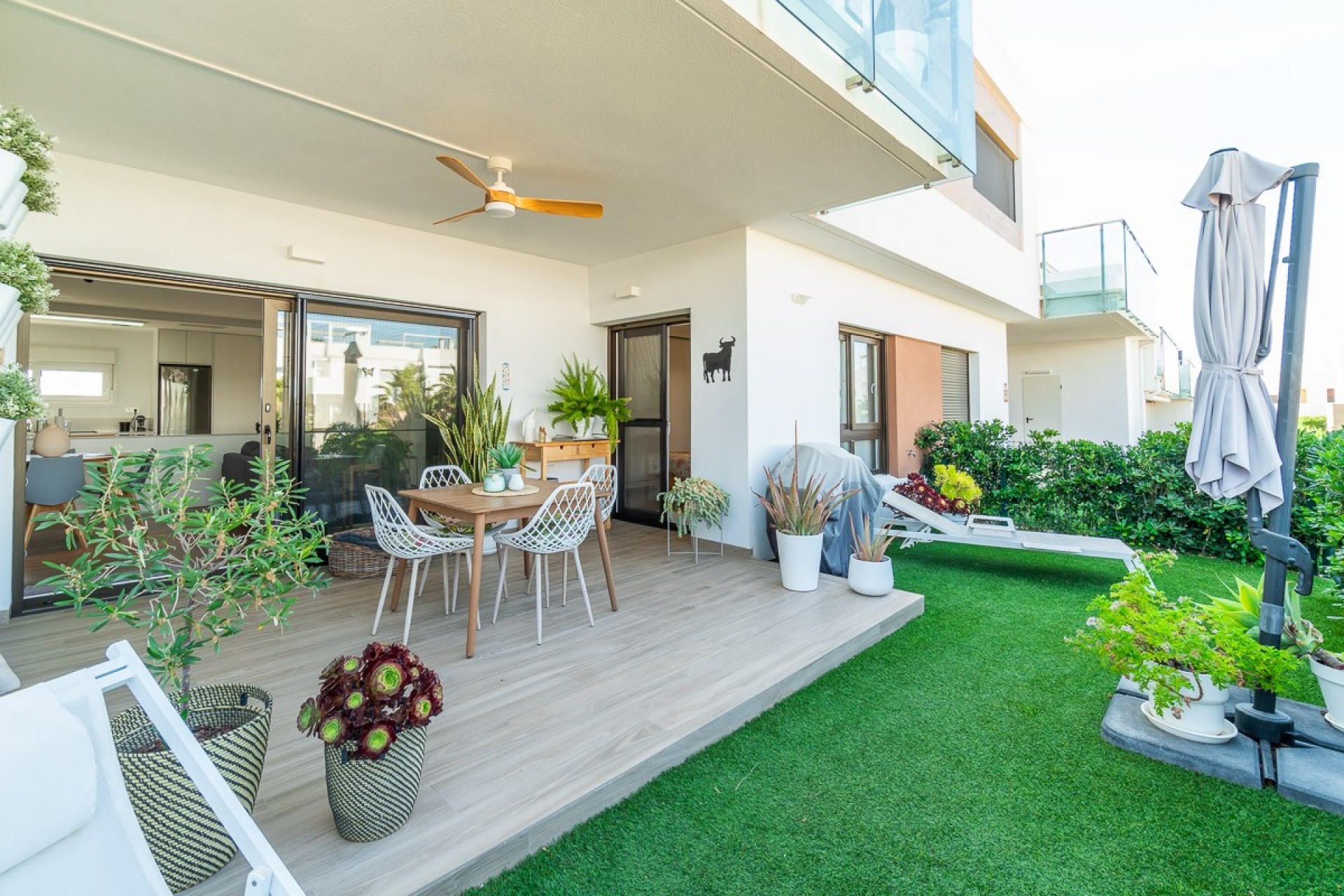 L’appartement dispose d’une terrasse arrière orientée Est offrant une vue sur les jardins et les espaces communautaires ainsi que sa piscine entourée de gazon naturel ainsi qu’une terrasse avant avec emplacement pou un véhicule.