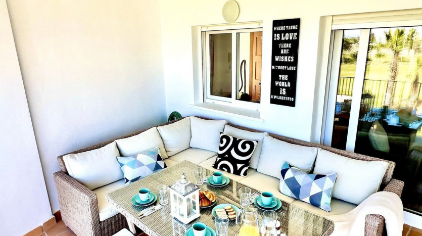 Appartement deux chambres situé en plein coeur d’un resort de golf entourée d’espaces verts avec piscine communautaire sur Sucina à seulement 20 minutes des plus belles plages de la région et à seulement 25 km de la Zenia.