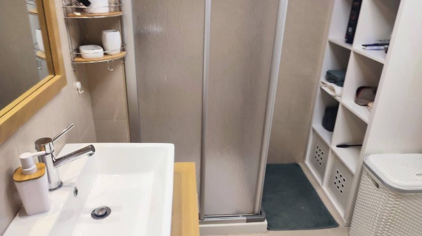 L’appartement situé au première étage, propose un salon & salle à manger avec une cuisine équipée ouverte sur le salon, deux chambres, une salle de bains.