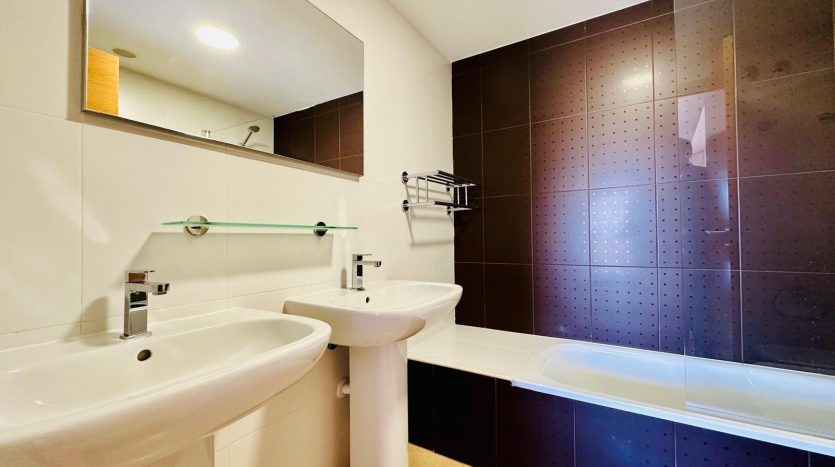 Chacunes des chambres doubles sont équipées d’armoires encastrées pleine hauteur offrant un important espace de rangement et de penderie. La chambre principale bénéficie d’une salle de bains familiale à deux lavabos, tandis que la deuxième chambre partage une salle de bains adjacente.