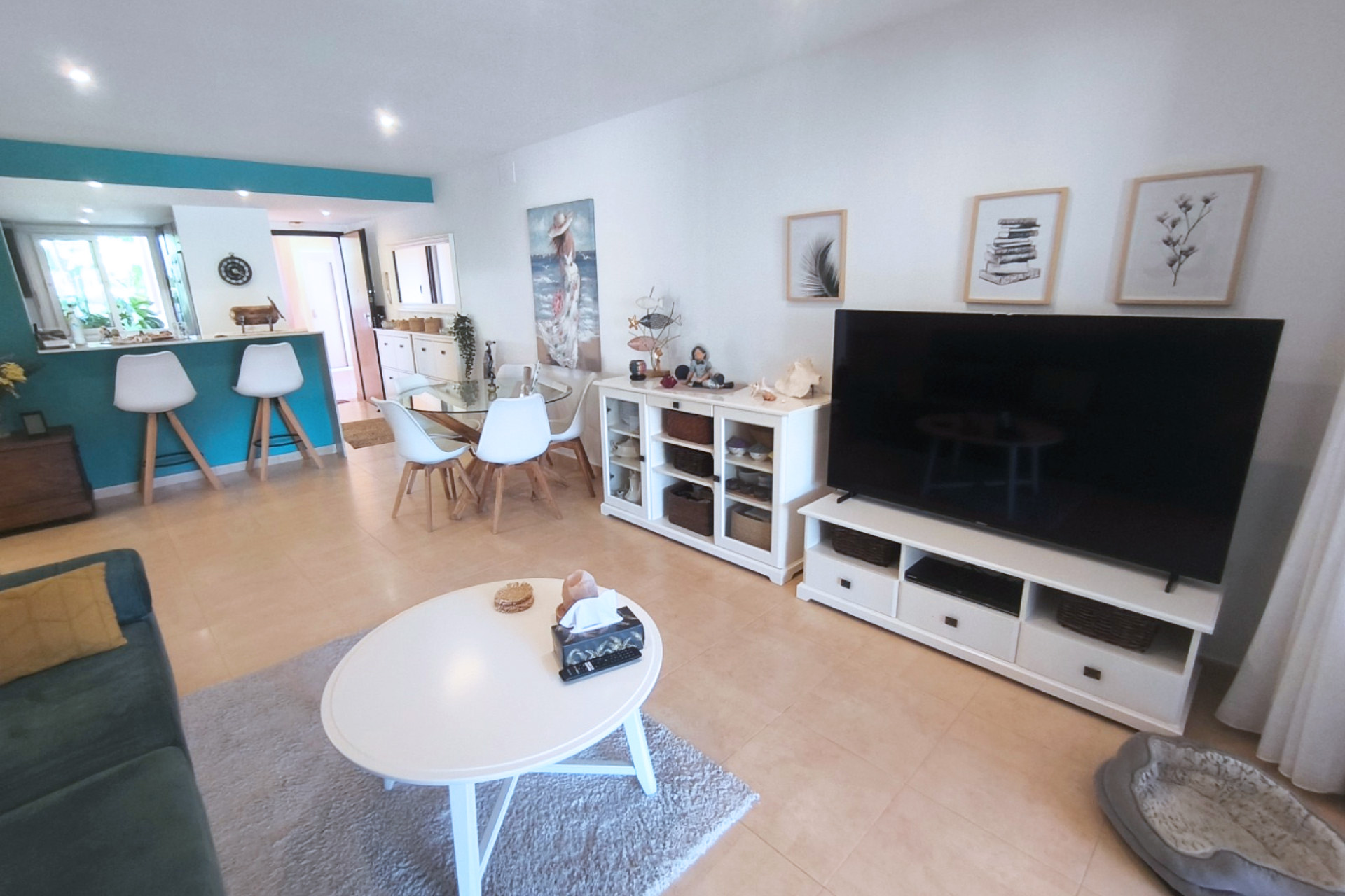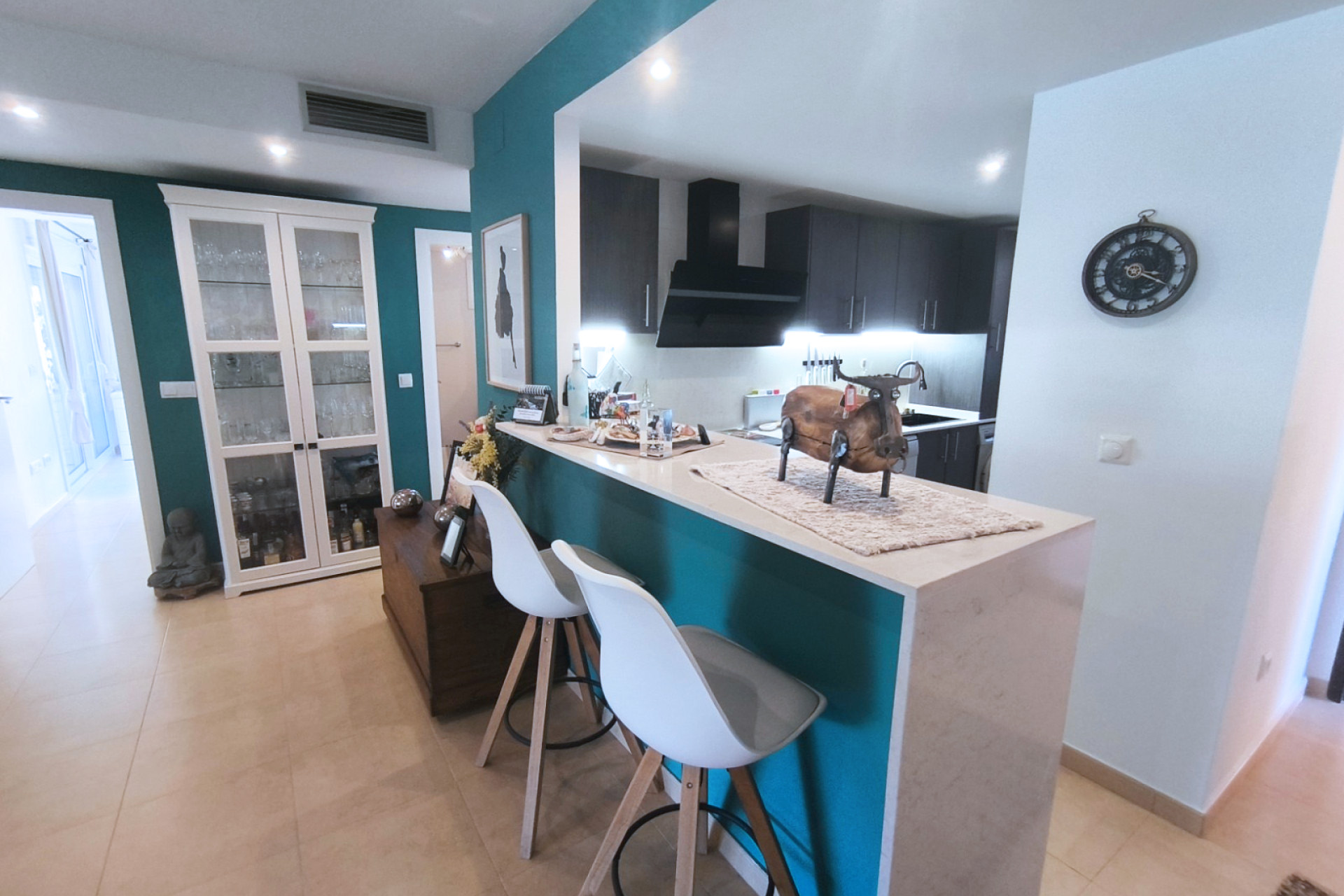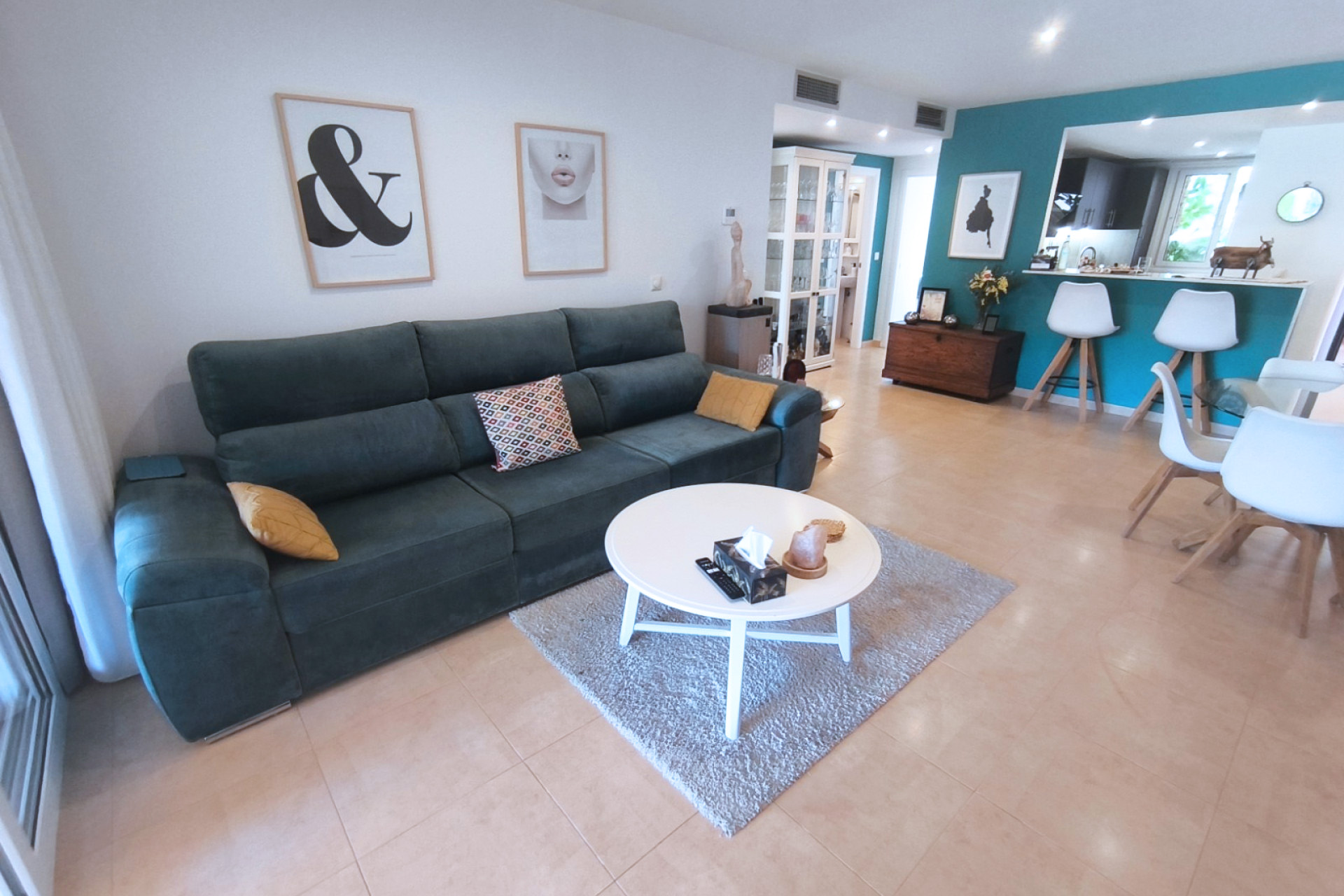 La cuisine moderne et attrayante est séparée du salon / salle à manger principal par un bar à petit-déjeuner pratique qui pourrait également servir de bar sympa. Le salon principal – lorsque les portes-fenêtres sont complètement ouvertes – crée un grand et fantastique espace ouvert parfait pour recevoir famille et amis.