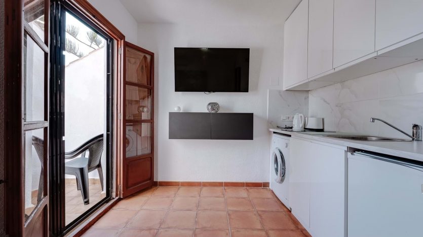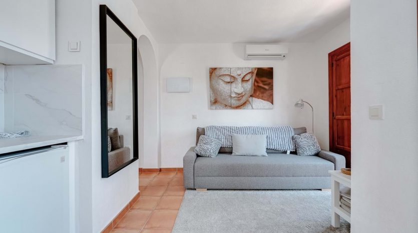 L’appartement est situé au premier étage et propose, un salon & salle à manger avec une cuisine entièrement équipée ouverte, une chambre ainsi qu’une salle de bains.