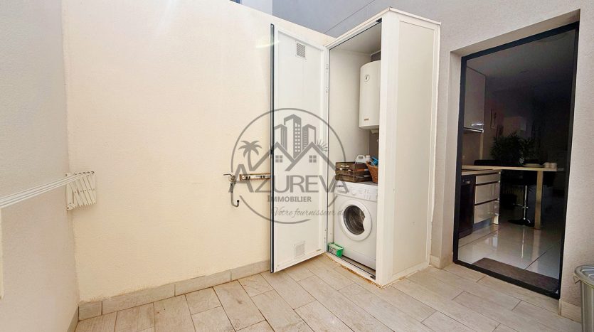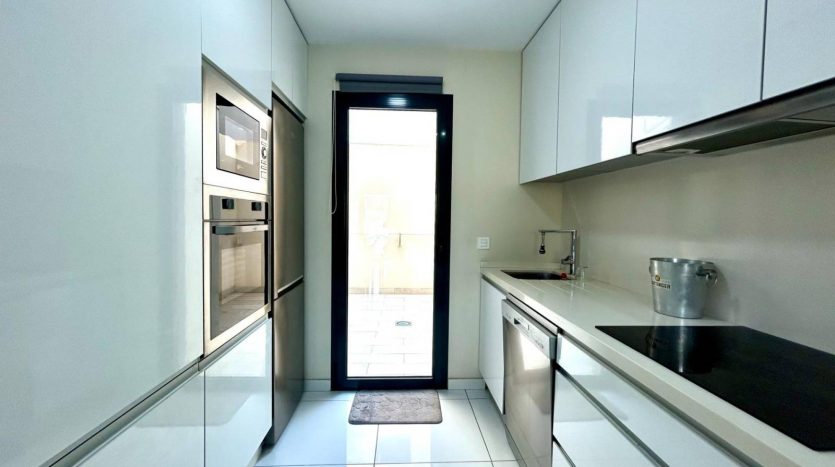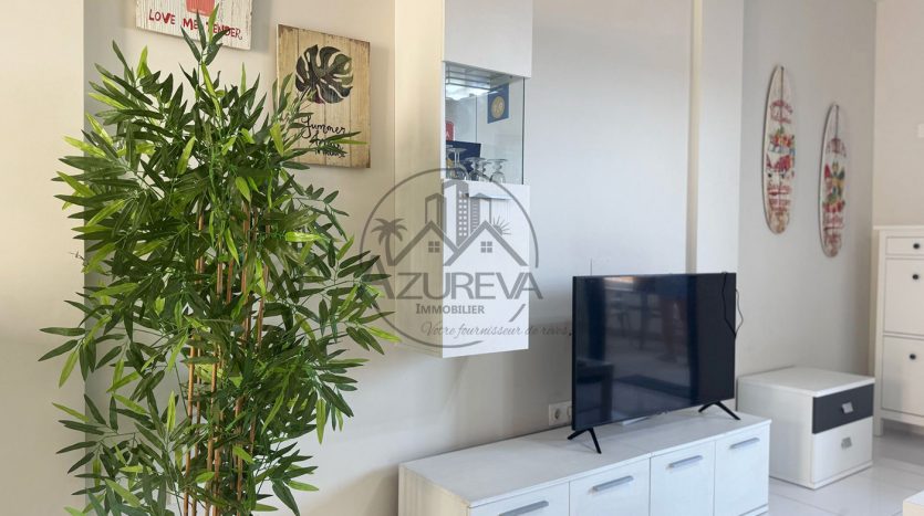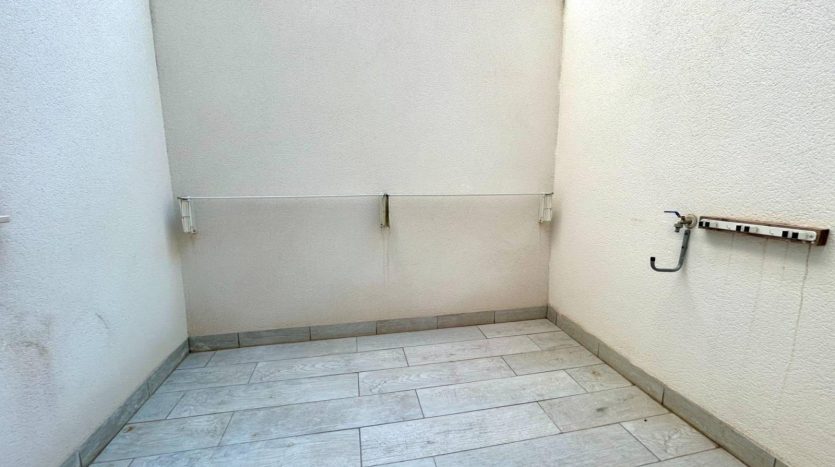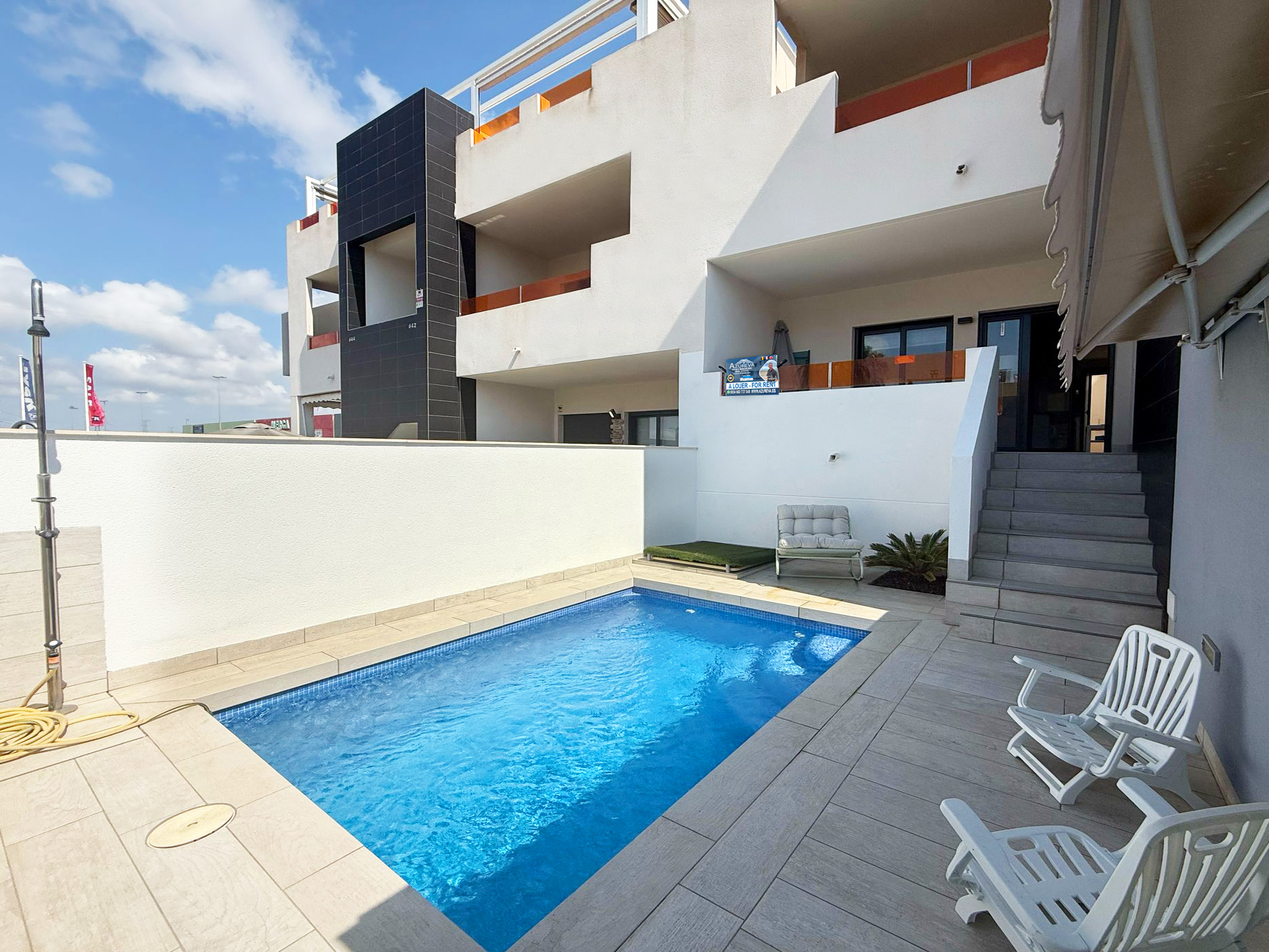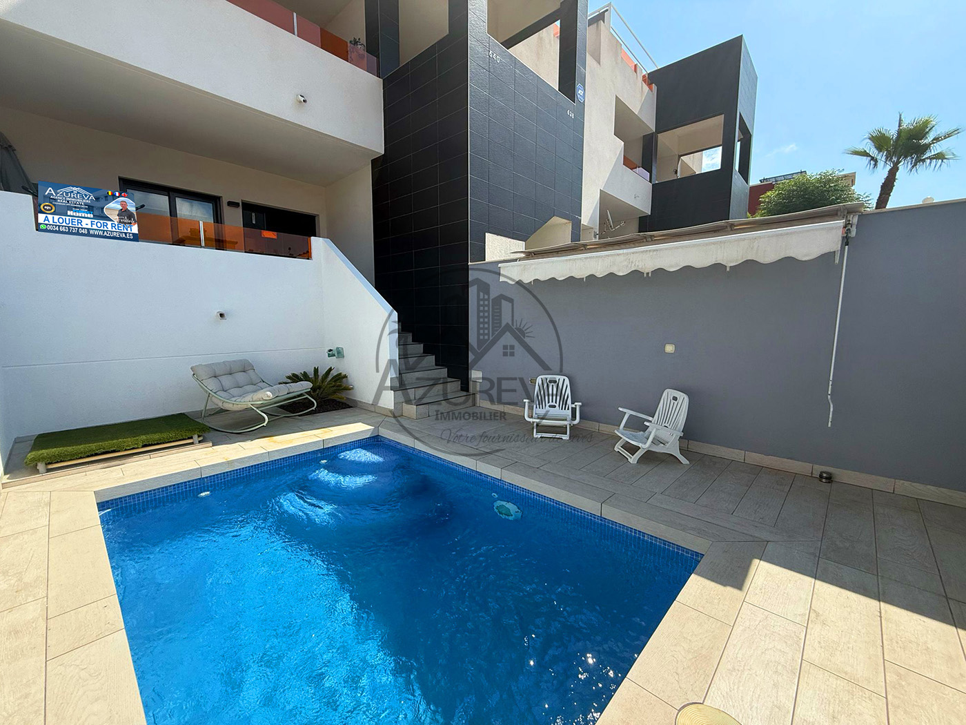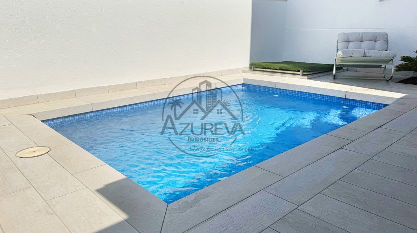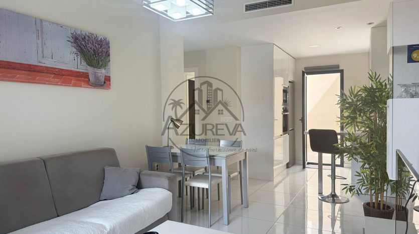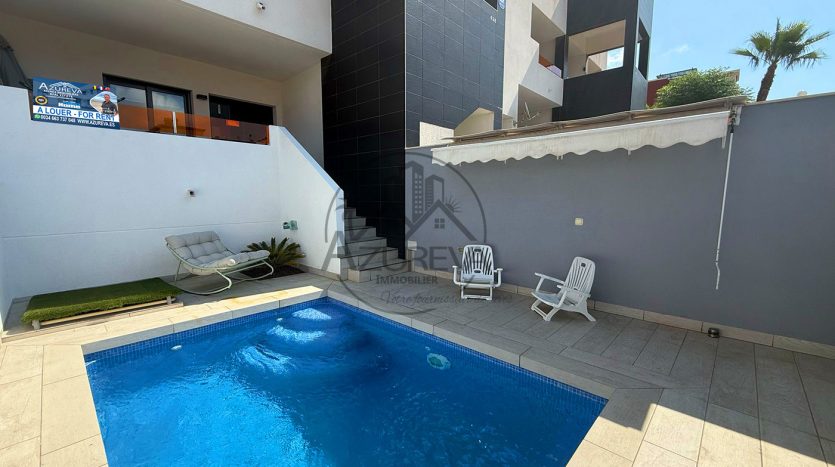 L’appartement dispose d’une jolie terrasse sur élevée avant ensoleillée plein sud avec sa propre piscine privée mais également un accès direct à de jolis espaces communautaires ainsi que sa piscine entourée de gazon naturel à 10 mètres.