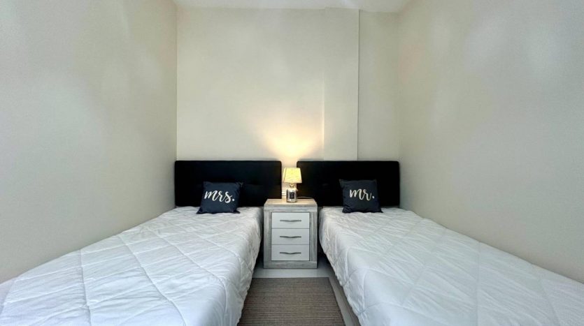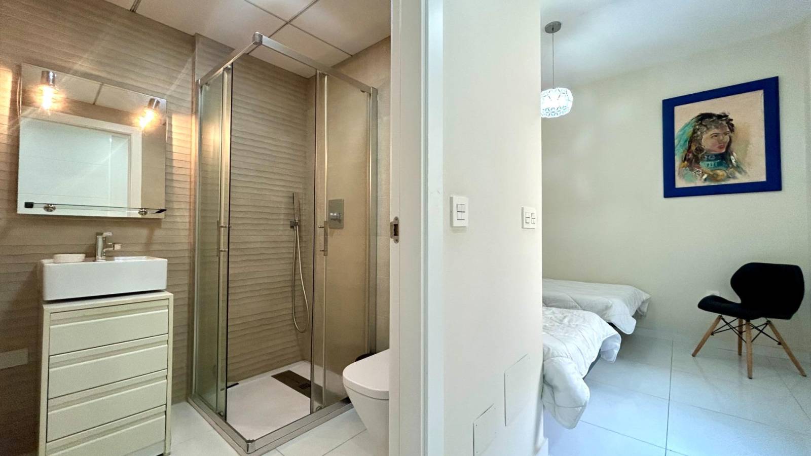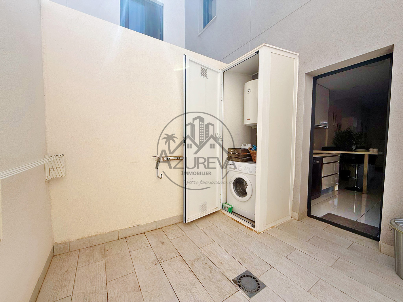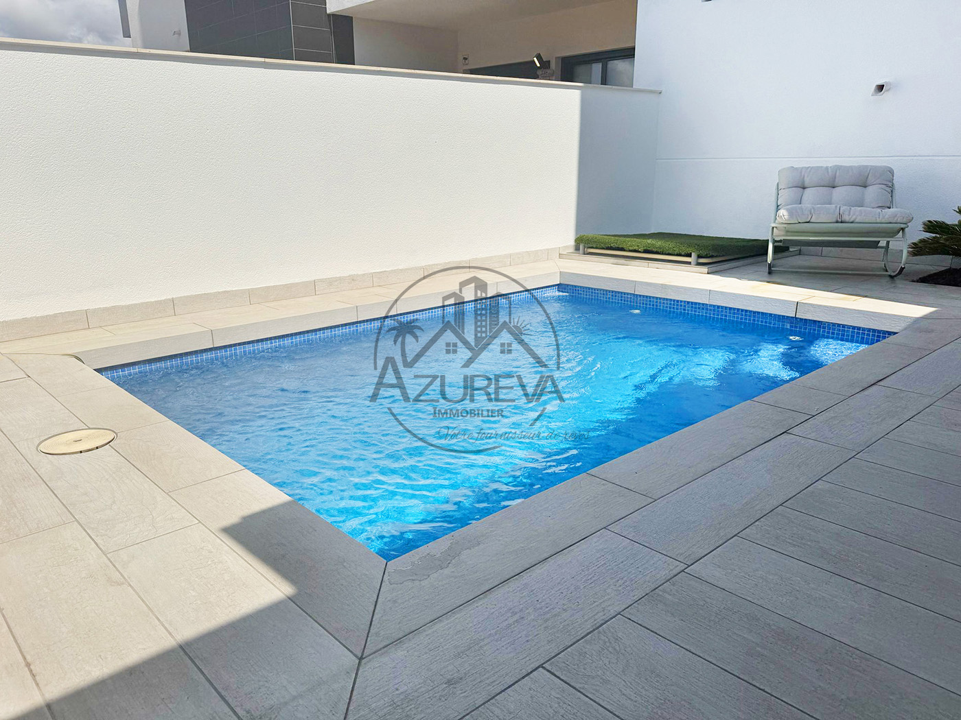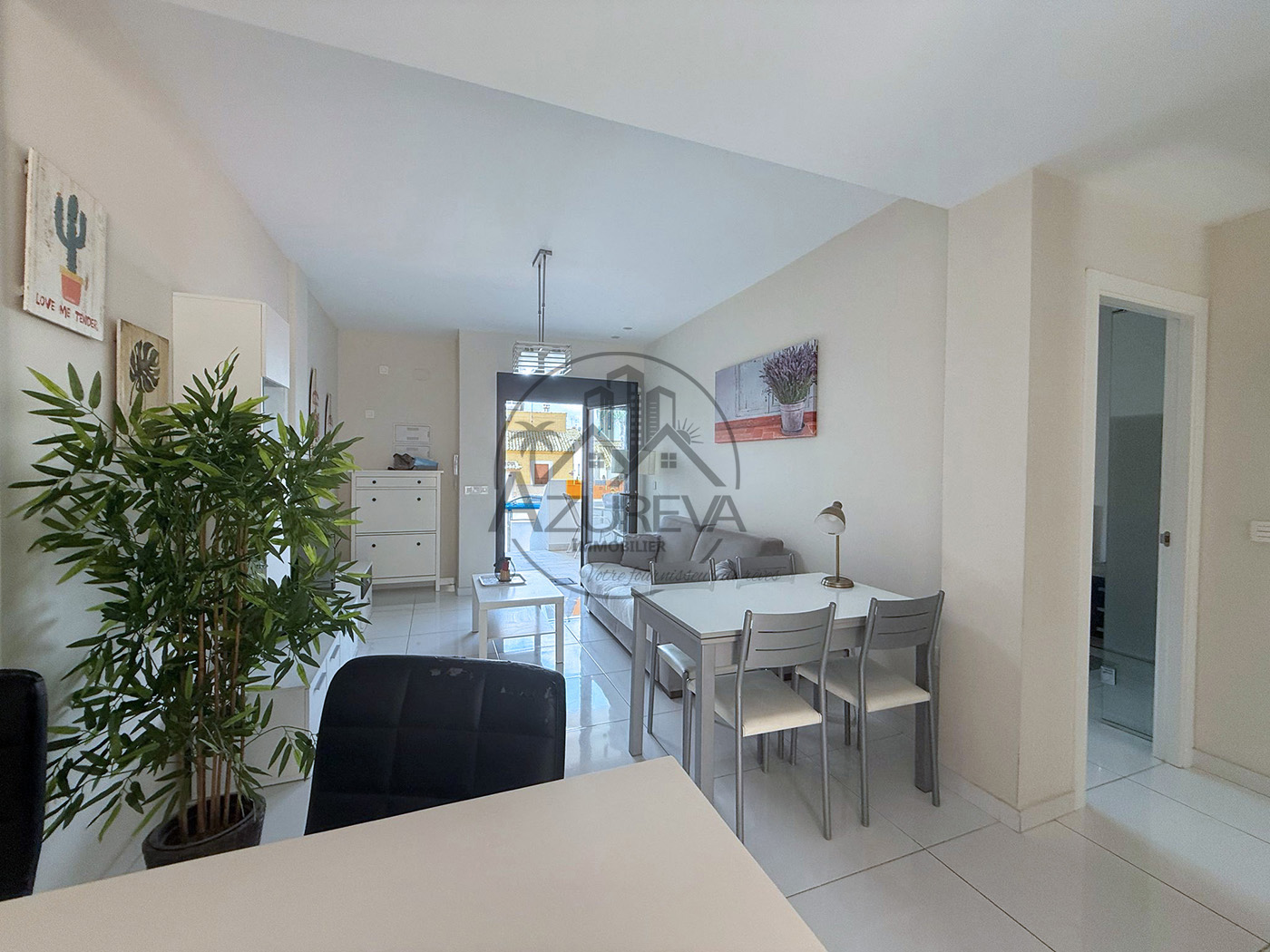 L’appartement dispose d’une jolie terrasse sur élevée avant ensoleillée plein sud avec sa propre piscine privée mais également un accès direct à de jolis espaces communautaires ainsi que sa piscine entourée de gazon naturel à 10 mètres.