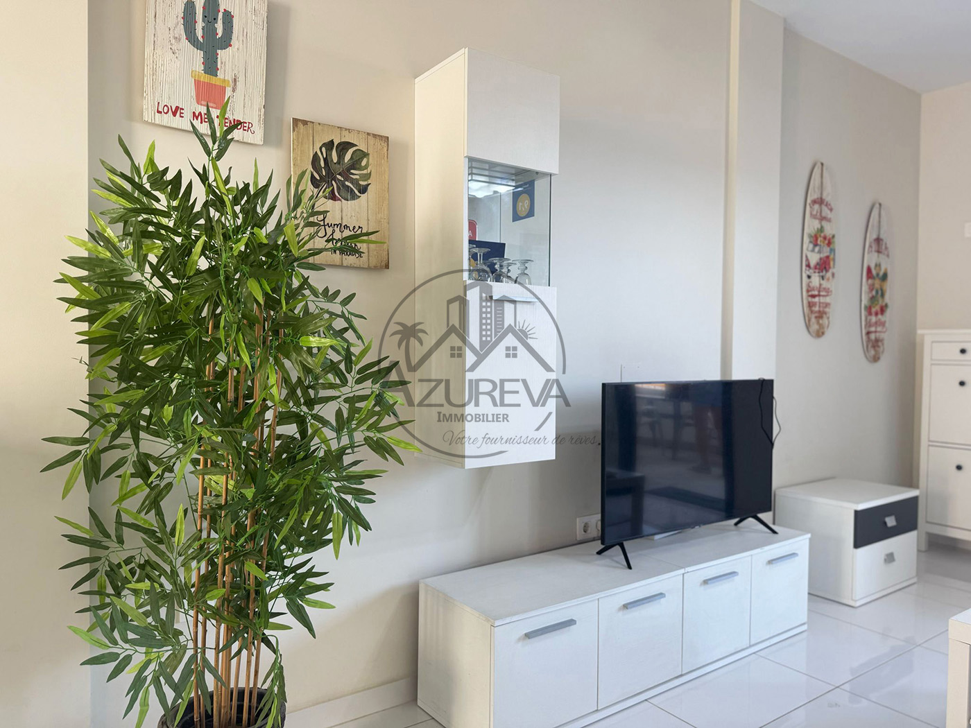 L’appartement situé au rez de chaussée, propose, un salon et salle à manger, une cuisine équipée ,deux chambres et deux salles de bains complètes dont une dans la chambre principale.