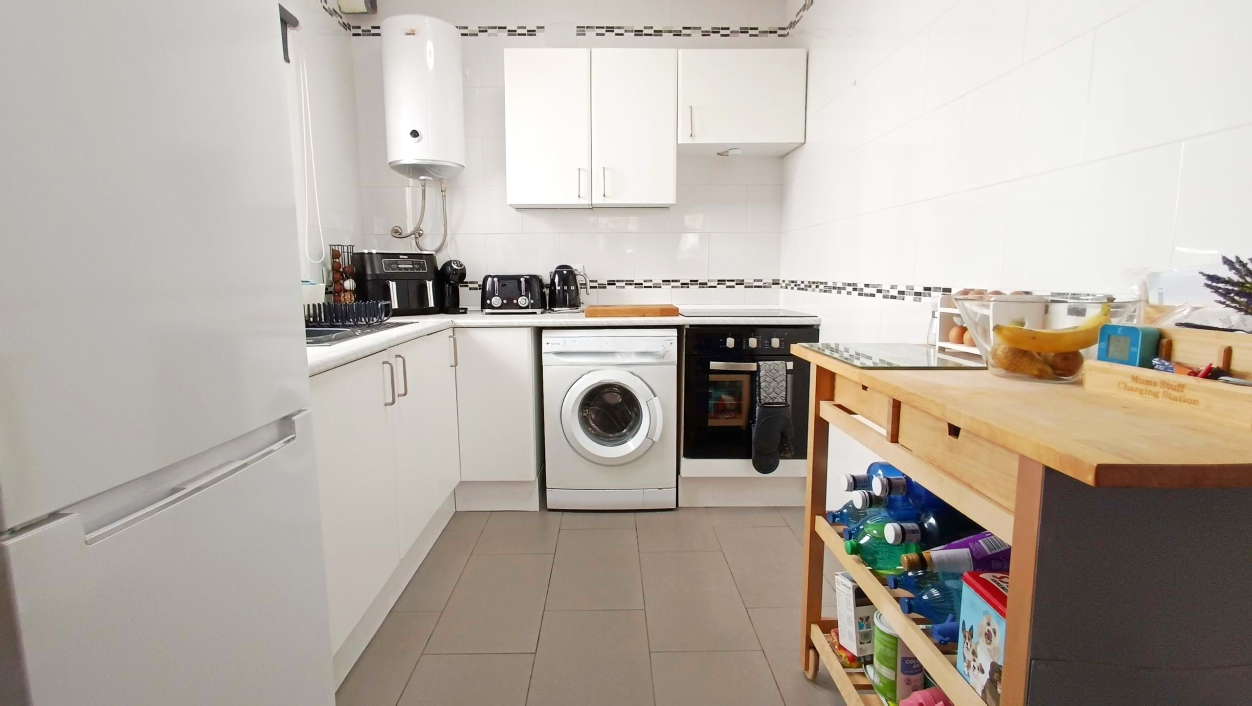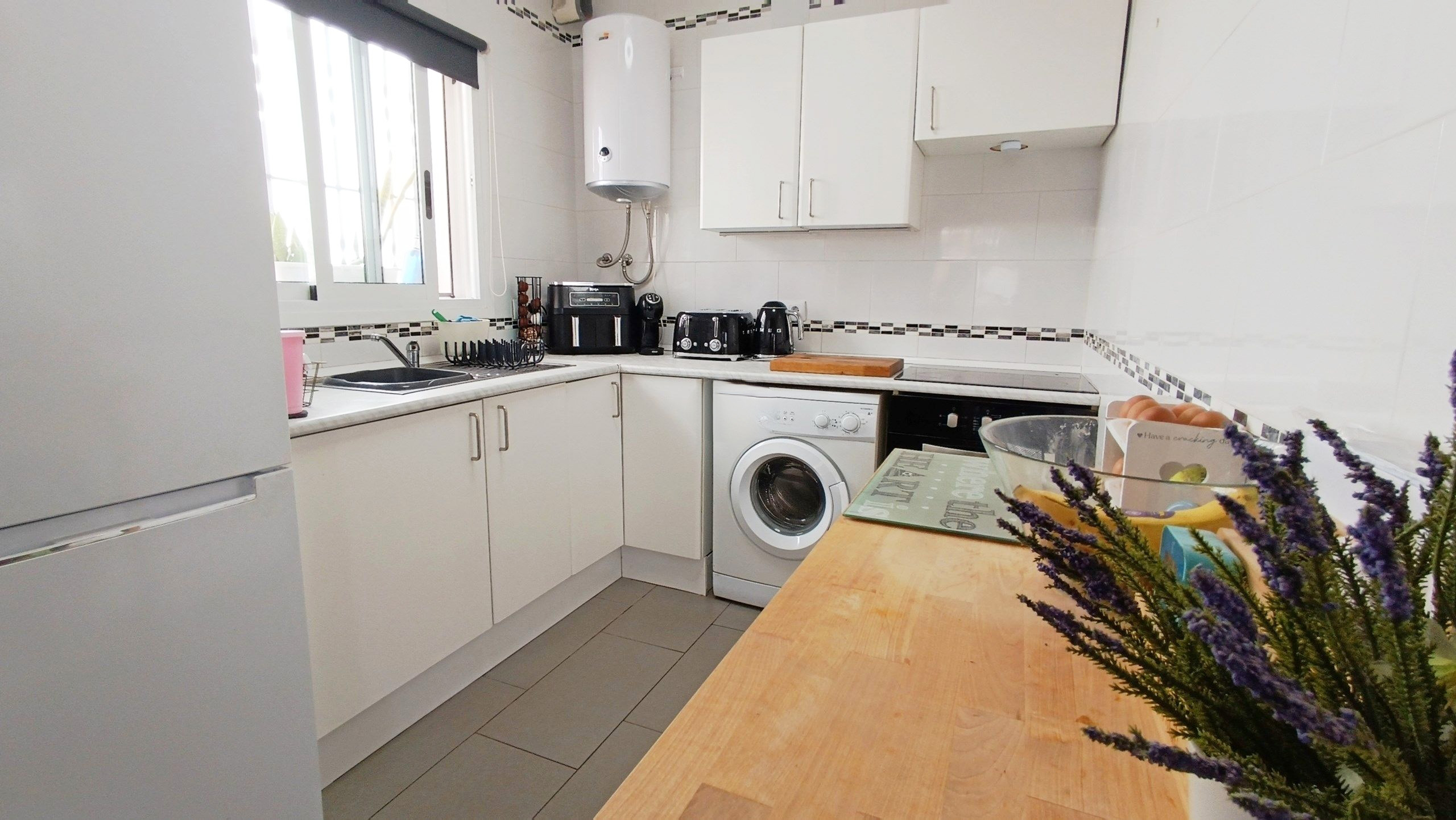La propriété offre une intimité accrue, de jolies vues verdoyantes sur les jardins et une luminosité intérieure accrue. L’entrée s’ouvre sur une grande terrasse, actuellement utilisée comme salle à manger, avec des portes-fenêtres menant à un coin salon, idéal pour savourer un café matinal, un séjour lumineux et spacieux avec cuisine ouverte, rénovée avec élégance grâce à un nouveau carrelage et des fenêtres supplémentaires pour encore plus de luminosité.