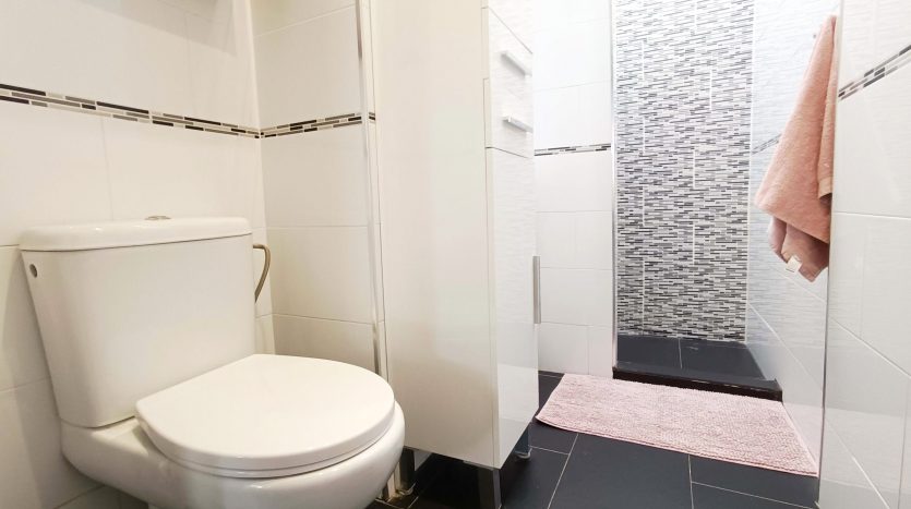 Celle dispose d’une belle terrasse avant de 30 m2 carrelée avec un espace coin salon extérieur ainsi qu’un accès a une jolie piscine communautaire.
