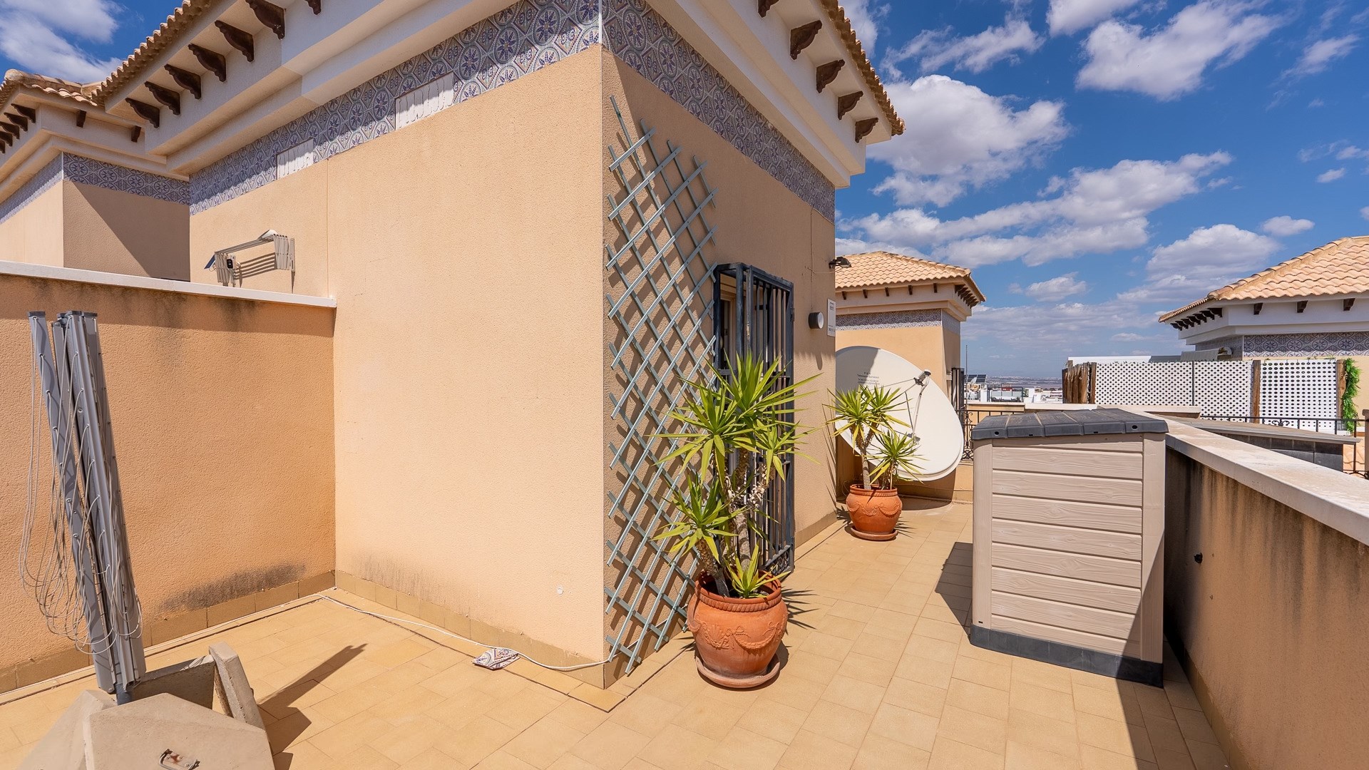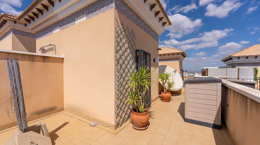 La propriété dispose d’une terrasse avant orientée sud avec emplacement pour un véhicule ainsi qu’un solarium privé sur le toit MAIS également un accès à une jolie piscine communautaire entourée de gazon naturel.