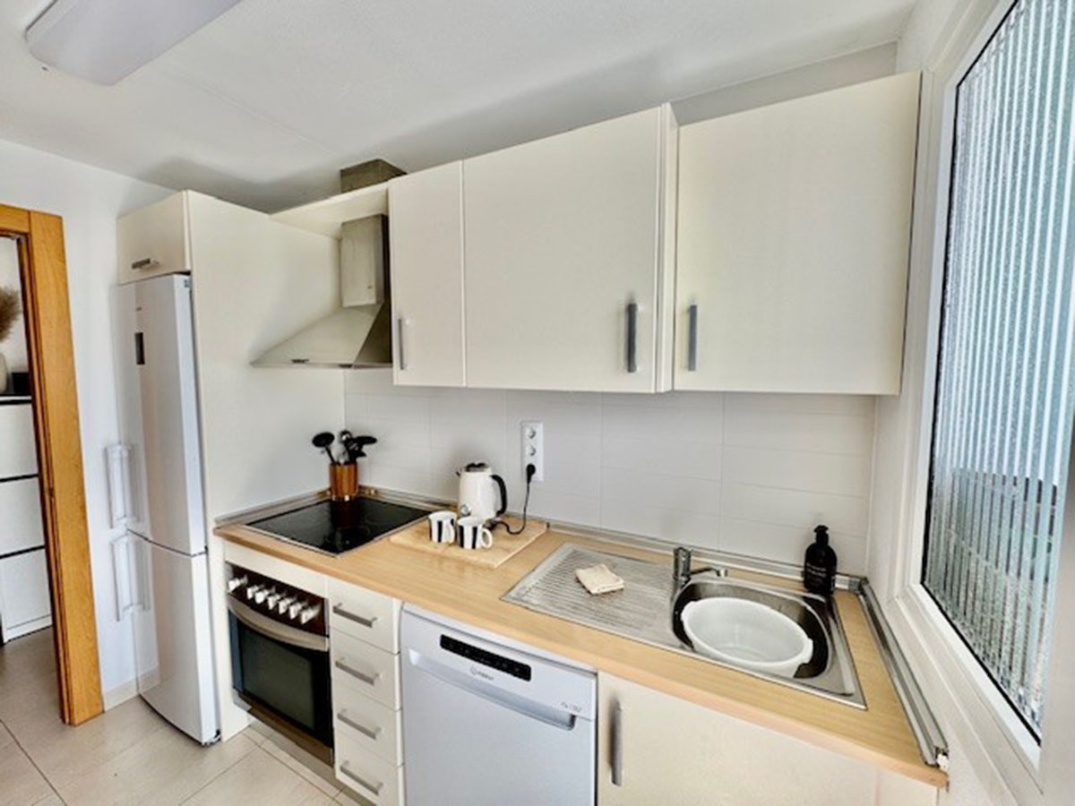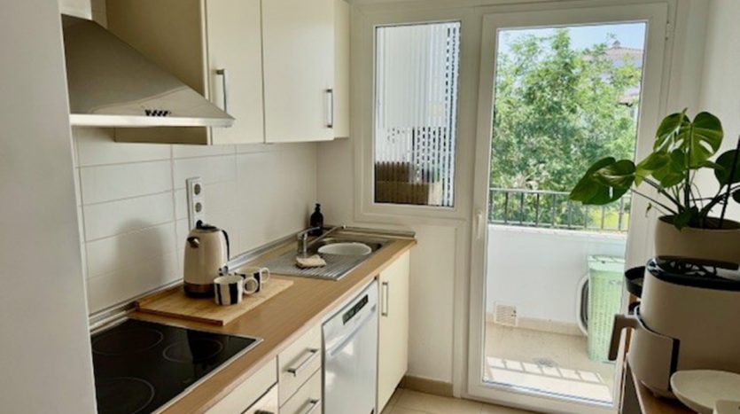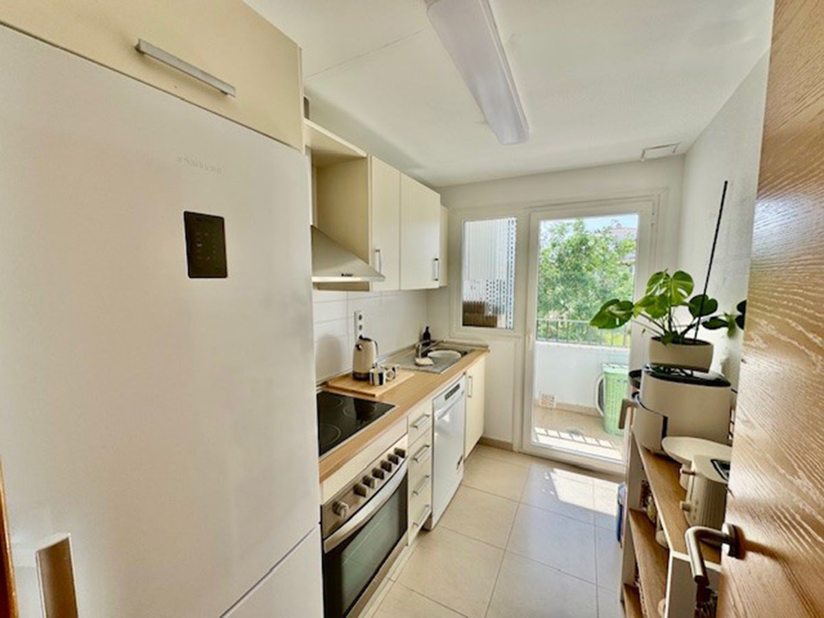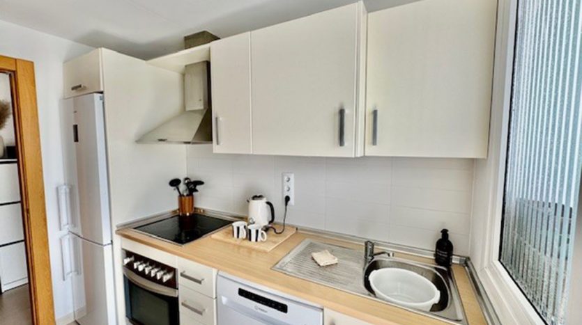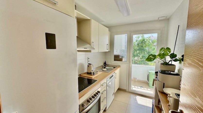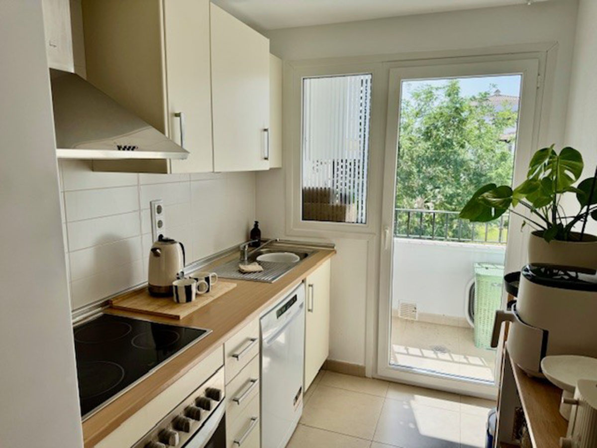 L’appartement situé au première étage, propose un salon & salle à manger avec une cuisine équipée ouverte sur le salon, deux chambres, une salle de bains.