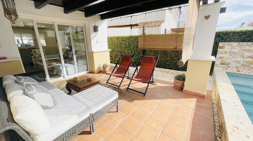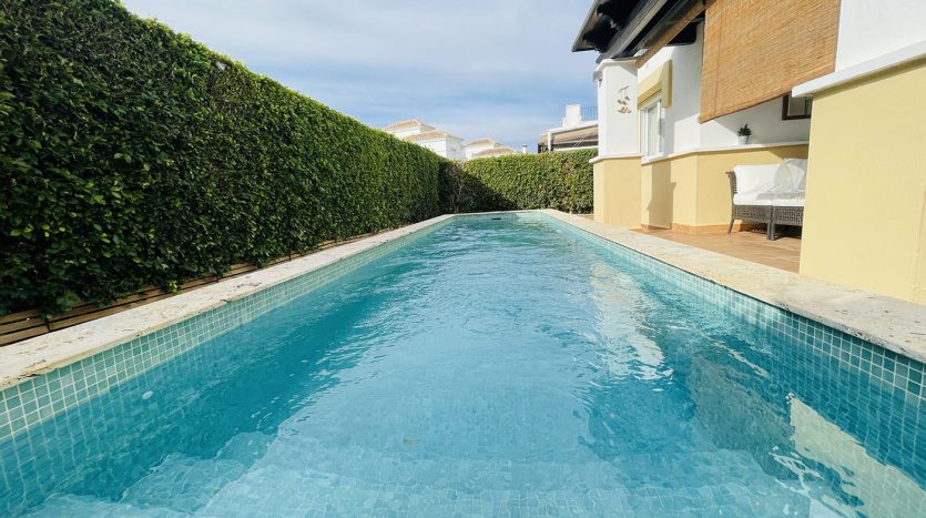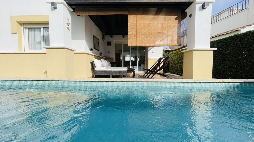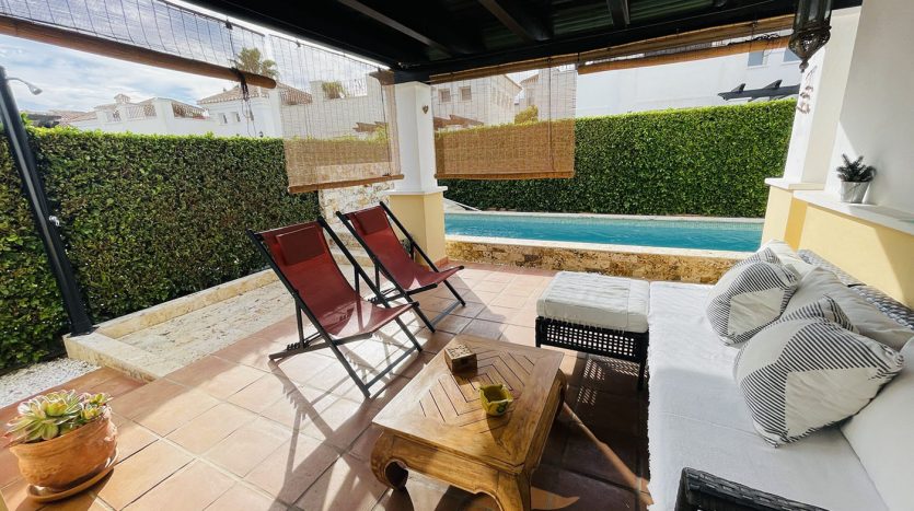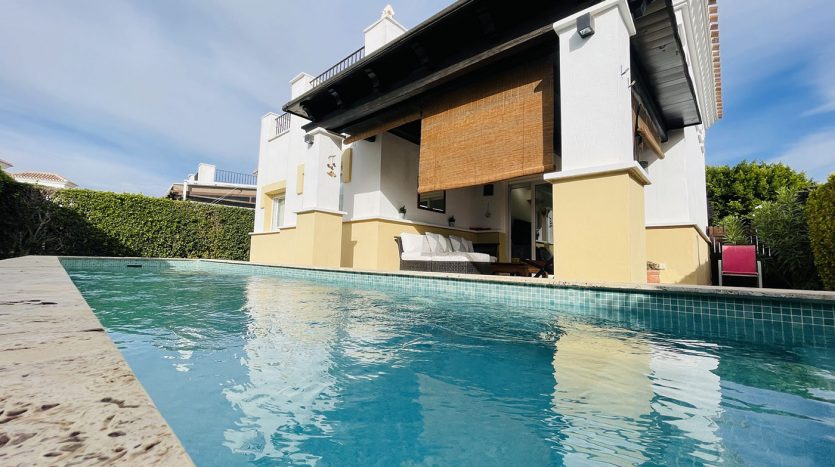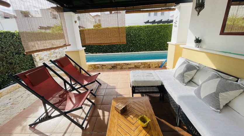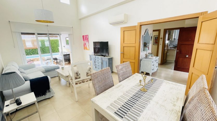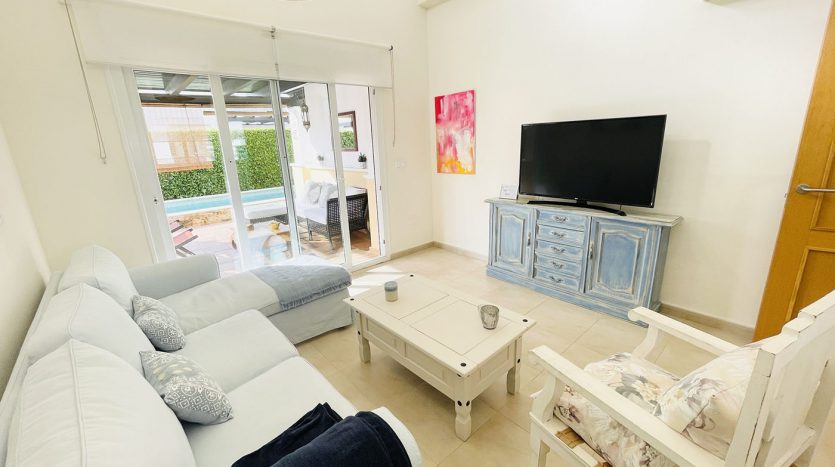 Superbe villa de style méditerranéen deux chambres située en plein coeur d’un resort de golf entourée d’espaces verts avec piscine communautaire sur Roldan à seulement 20 minutes des plus belles plages de la région et à seulement 25 km de la Zenia.