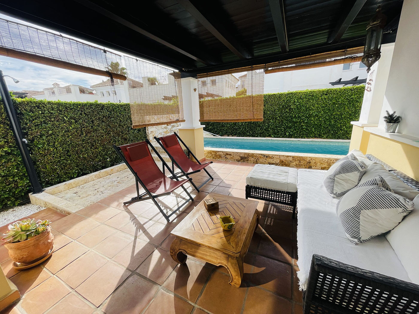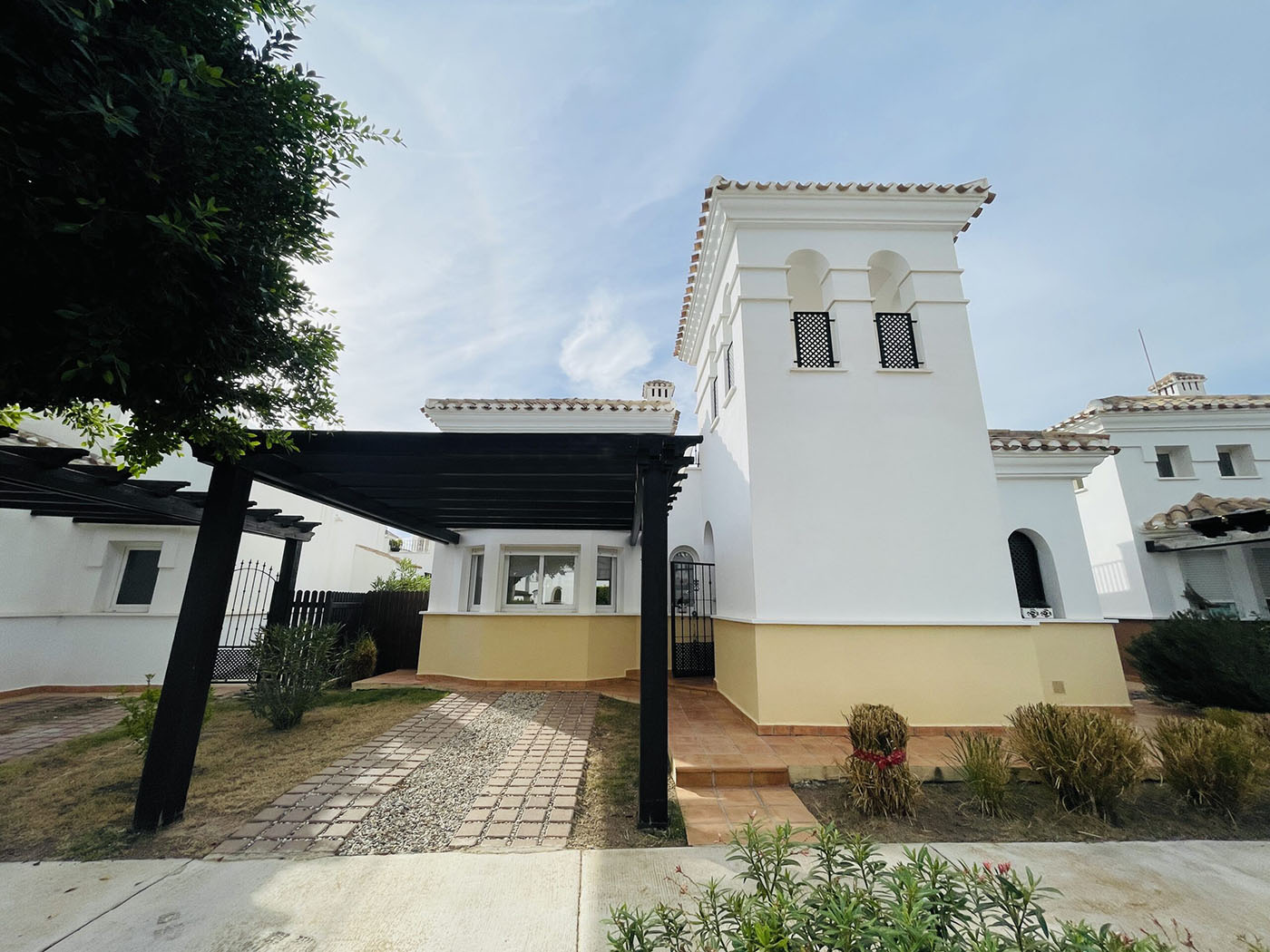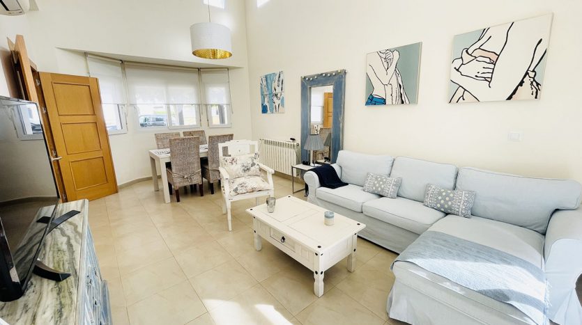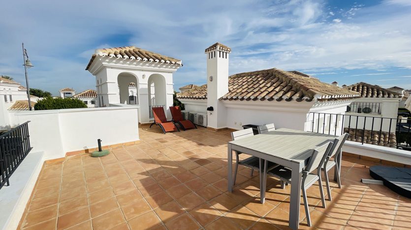 Superbe villa de style méditerranéen deux chambres située en plein coeur d’un resort de golf entourée d’espaces verts avec piscine communautaire sur Roldan à seulement 20 minutes des plus belles plages de la région et à seulement 25 km de la Zenia.